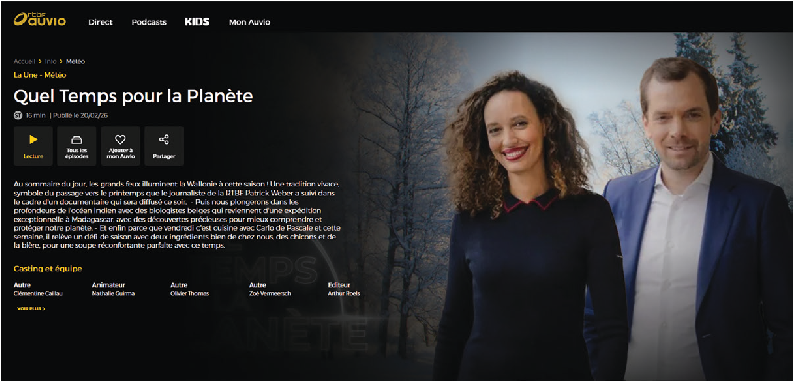 Le magazine Quel temps pour la planète !, présenté en alternance par Nathalie Guirma et Stéphane Piedboeuf, propose également des clés pour mieux comprendre les enjeux liés à la météo et au climat.